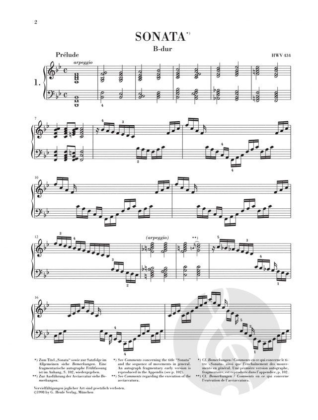 Seine Claviersachen sind unvergleichlich, und den Kennern des Claviers fast unentbehrlich' urteilt der Musiktheoretiker Johann Anton Scheibe im Jahre 1743 über die Klaviermusik Georg Friedrich Händels. Mittels der zweiten, gedruckten Sammlung von Klaviersuiten und Einzelstücken des großen Barockmeisters aus dem Jahre 1733 kann sich der interessierte Pianist ein farbenreiches Bild davon machen. Unter den mit 'Sonate', 'Suite', 'Prélude' oder 'Chaconne' betitelten Stücken HWV 434-442 befindet sich die bekannte 'Chaconne G-dur' mit 21 Variationen, die auch heute noch in den Konzertsälen lebendig ist. Außerdem entdeckt der Spieler hier die 'Aria' mit fünf anmutig verspielten Variationen, die Johannes Brahms mit einer eigenen Variationsreihe berühmt gemacht hat. Da die Sammlung in London und Amsterdam seinerzeit ohne Händels Zustimmung auf den Markt kam und sich viele Fehler in die Drucke einschlichen, ist eine fundierte Urtextausgabe unerlässlich. Klaus Schildes zurückhaltender Fingersatz hilft über so manche Klippe hinweg und zeigt überraschende Perspektiven auf.