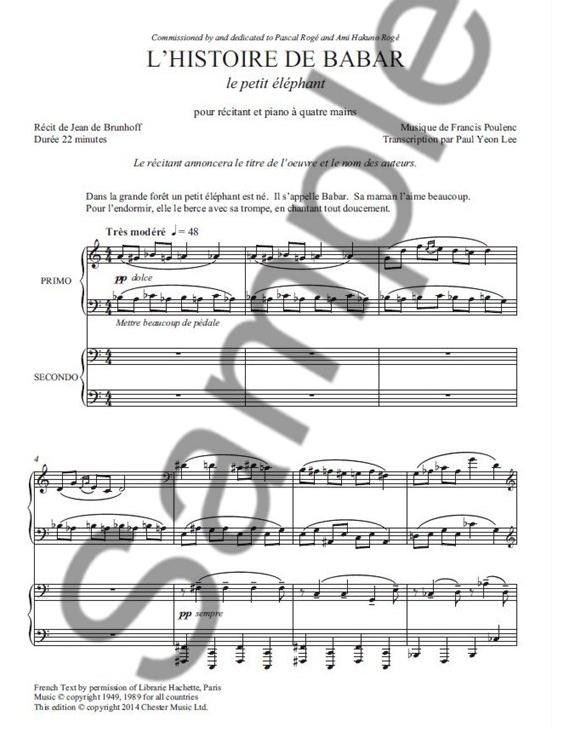 During the visit to Brive-la-Gaillarde in 1940, Poulenc sketched a little piece for the children of his cousins: Sophie, Sylvie, Benoit, Florence and Delphine Périer, Yvan, Alain, Marie-Christine and Marguerite-Marie Villotte, and their two friends Marthe Bosredon and André Lecoeur. This took the form of a musical background to Jean de Brunhoff's popular illustrated children's story about Babar, a baby elephant whose mother is killed by a huntsman. Fortunately Babar meets a kind elderly lady who dresses him in a fine suit and gives him an impressive motor-car. However, Babar feels homesick for his forests, and is pleased when his cousins, Arthur and Celeste, find him and needs no persuasion to go home with them. Back in the forest, where the King of the Elephants has eaten a poisonous mushroom, Babar is elected to succeed as King. He marries Celeste, and the last we hear of him is thinking of a rosy future as he dreamily looks up at a marvellously star-filled sky. Poulenc's score, to which he returned and completed in 1945, is for a narrator and a Piano, so written that the individual sections offer the pianist a number of self-contained descriptive pieces, such as a LULLABY, a RÊVERIE, a GALOP, a NOCTURNE and so on. Indeed, some of Poulenc's finest Piano music is found in these charmimg pages. In 1962, Jean Françaix made an orchestral version, and BABAR has been enjoyed by children of all ages all over the world. An English translation of the text was made by Nelly Rieu. A separate insert with English translation is included.