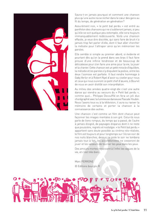 Ein Lied ist wie ein Film, dessen mentale Bilder jeder nach Belieben gestalten kann. Dieser hier erzählt uns von zerbrochenen Bindungen, von der Zeit, die vergangen ist, von einem anderen, der für immer fern ist, von verschwundenen Landschaften, von denen nur noch Staub, Bedauern und Nostalgie übrig sind. "Le Petit bal perdu" gehört zweifellos zum neorealistischen Kino, der Film ist immer und für lange Zeit auf der schwarzen Leinwand unserer weißen Nächte, auf seiner Tanzfläche wird der Abend nie ganz einbrechen, die Akkordeonisten werden nicht aufhören zu spielen und die Walzer werden sich Auge in Auge drehen.