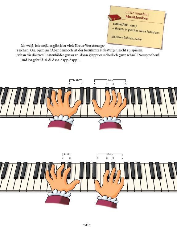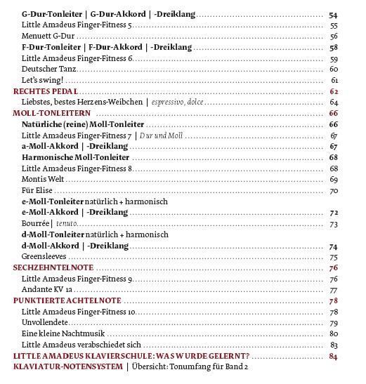 Die Little Amadeus Finger-Fitness-Übungen ziehen sich wie ein roter Faden durch die Methode und dienen dem Erlernen von Ausdauer und Geläufigkeit. Das rechte Pedal, zum Aushalten und Verbinden der Töne, wird erklärt und kommt in vielen Stücken zur Anwendung. Selbstverständlich erzählt Little Amadeus, Freund und Helfer, Geschichtenerzähler und Klavierlehrer auch im zweiten Teil der Klavierschule begeistert aus seinem Leben. Er erklärt Musikbegriffe und gibt viele Spieltipps rund ums Klavier.