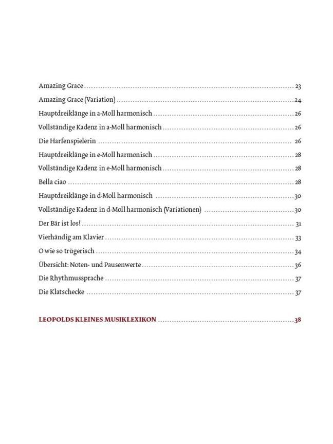 Auch das Arbeitsbuch ist interessant und ansprechend gestaltet und bearbeitet dem Wissenstand entsprechend z. B. die Themen Sexte, Septime, Dreiklänge, C-Dur Tonleiter, Kadenzen, Rhythmus und Musiktheorie. Außerdem ist Leopolds kleines Musiklexikon enthalten!