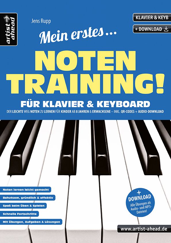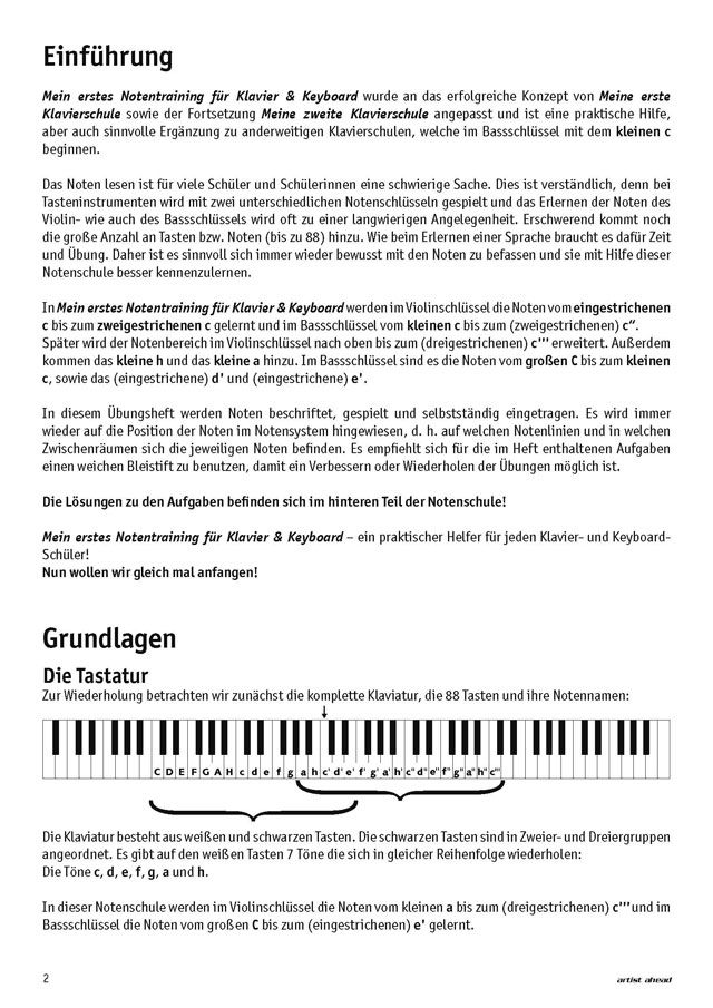 In 'Mein erstes Notentraining für Klavier & Keyboard' werden im Violinschlüssel die Noten vom (eingestrichenen) c' bis zum (zweigestrichenen) c'' gelernt und im Bassschlüssel vom kleinen c bis zum (zweigestrichenen) c''. Später wird der Notenbereich im Violinschlüssel nach oben hin bis zum (dreigestrichenen) c''' erweitert. Außerdem kommen das kleine h und das kleine a hinzu. Im Bassschlüssel sind es die Noten vom großen C bis zum kleinen c sowie das (eingestrichene) d' und (eingestrichene) e'.