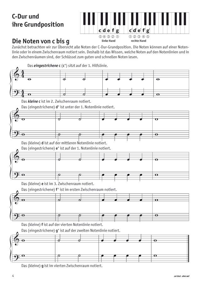 Das Noten lesen ist für viele Schüler und Schülerinnen eine schwierige Sache. Dies ist verständlich, denn bei Tasteninstrumenten wird in zwei unterschiedlichen Notenschlüsseln gespielt und das Erlernen der Noten des Violin- wie auch des Bassschlüssels wird oft zu einer langwierigen Angelegenheit. Hinzu kommt die große Anzahl an Tasten bzw. Noten (bis zu 88). Wie beim Erlernen einer Sprache braucht es dafür Zeit und Übung. Daher ist es sinnvoll sich immer wieder bewusst mit den Noten zu befassen und sie mit Hilfe dieser Notenschule besser kennenzulernen.