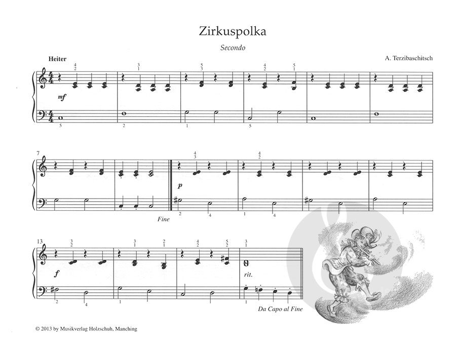 Die bildhaften und phantasievollen Kompositionen sind leicht bis sehr leicht gesetzt. Da der Primopart den Umfang von fünf Tönen nicht überschreitet, sind diese Stücke für den Anfangsunterricht am Klavier gut geeignet. Die Begleitstimme kann auch von einem anderen Schüler übernommen werden. Trotz der Einfachheit klingen die Stücke wunderschön und machen beim gemeinsamen Spielen superviel Spaß!