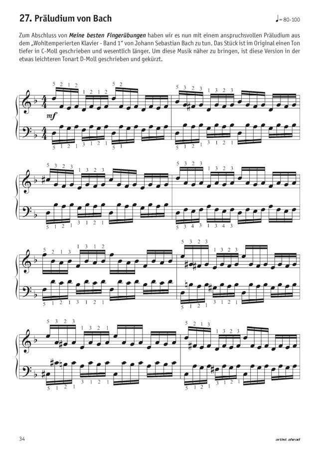 'Meine besten Fingerübungen' wurde sorgfältig an das Konzept von 'Meine erste Klavierschule' sowie der Fortsetzungen 'Meine zweite Klavierschule' und 'Meine dritte Klavierschule' angepasst. Die 27 enthaltenen Übungen und Spielstücke sind für das zweite und dritte Unterrichtsjahr geeignet und stellen auch für fortgeschrittene Spieler eine sinnvolle Ergänzung dar. Sie fördern die Geläufigkeit, Beweglichkeit und Schnelligkeit, sowie die Kraft und Ausdauer der Finger, aber auch die Koordination der rechten und linken Hand. Der durchdachte, logisch strukturierte Aufbau der Lektionen erleichtert das Lernen und motiviert darüber hinaus mit 11 klang-effektiven Übungsstücken in den Tonarten C-Dur, F-Dur, G-Dur, A-Moll und D-Moll.