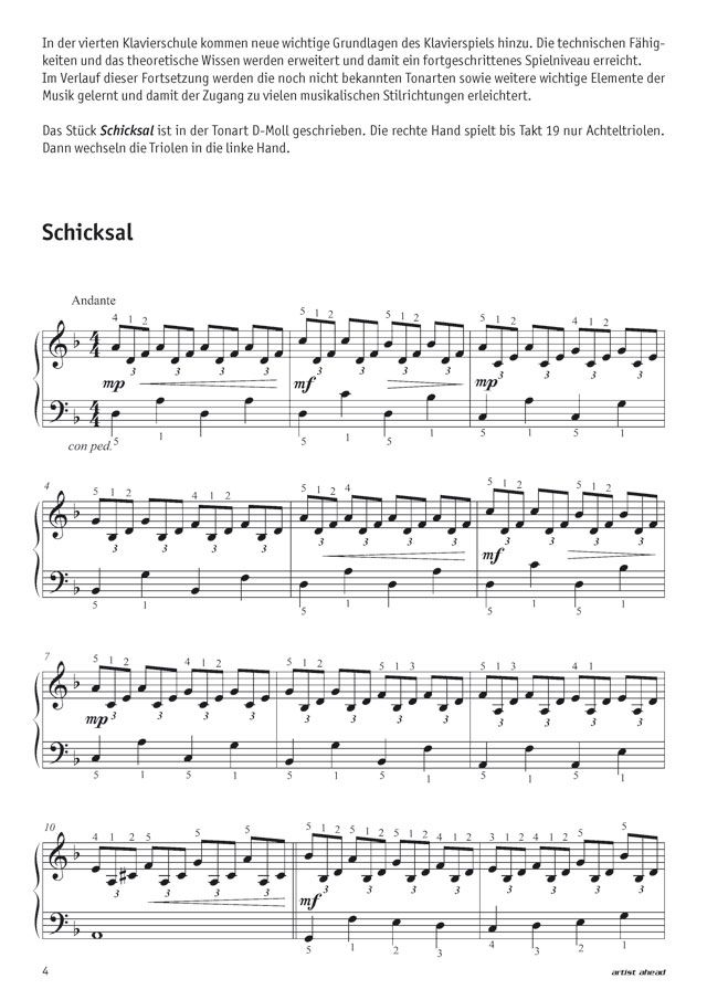 In dieser Fortsetzung wird das bereits Erlernte weiter vertieft und die spielerischen Fähigkeiten sowie das theoretische Wissen im klassischen und modernen Bereich erweitert. In der vierten Klavierschule kommen neue Lerninhalte wie die Tonarten As-Dur, Des-Dur, Ges-Dur, E-Dur, H-Dur und Fis-Dur, die sus-Akkorde, weitere Verzierungen, die chromatische Tonleiter, Akkordsymbole und Akkordbezifferungen sowie das Leadsheet hinzu. Weiterführend die Vorstellung der Tonika-, Subdominant- und Dominant-Parallele, die Akkorde der melodischen Molltonleiter und der verminderte Septakkord. Dem Schüler helfen dabei unter anderem die Abbildungen der Tastatur, welche die Orientierung erleichtern.