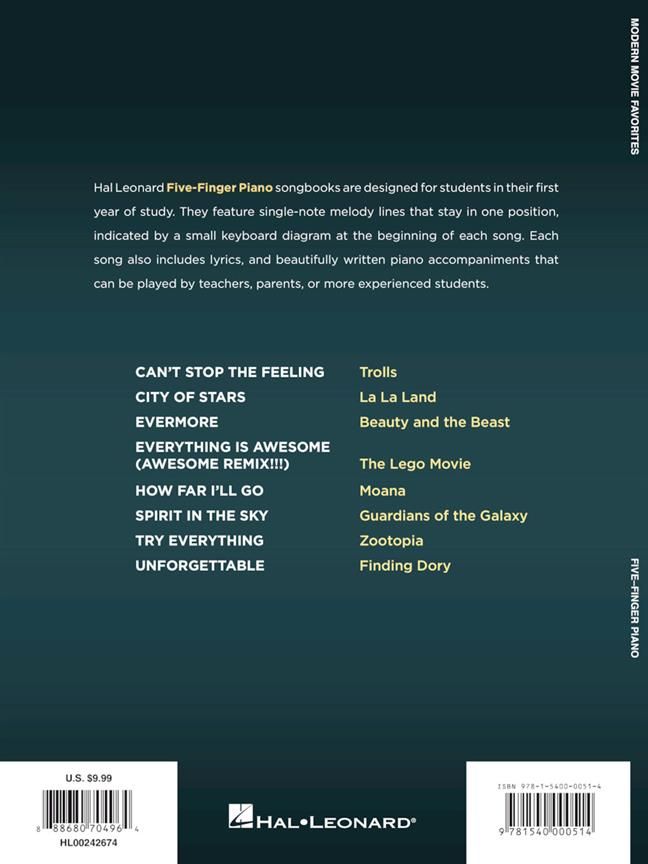 Kids just learning how to play piano will love these simple five-finger arrangements of eight modern movie songs including lyrics: Can't Stop the Feeling - City of Stars - Evermore - Everything Is Awesome (Awesome Remixx!!!) - How Far I'll Go - Spirit in the Sky - Try Everything - Unforgettable.