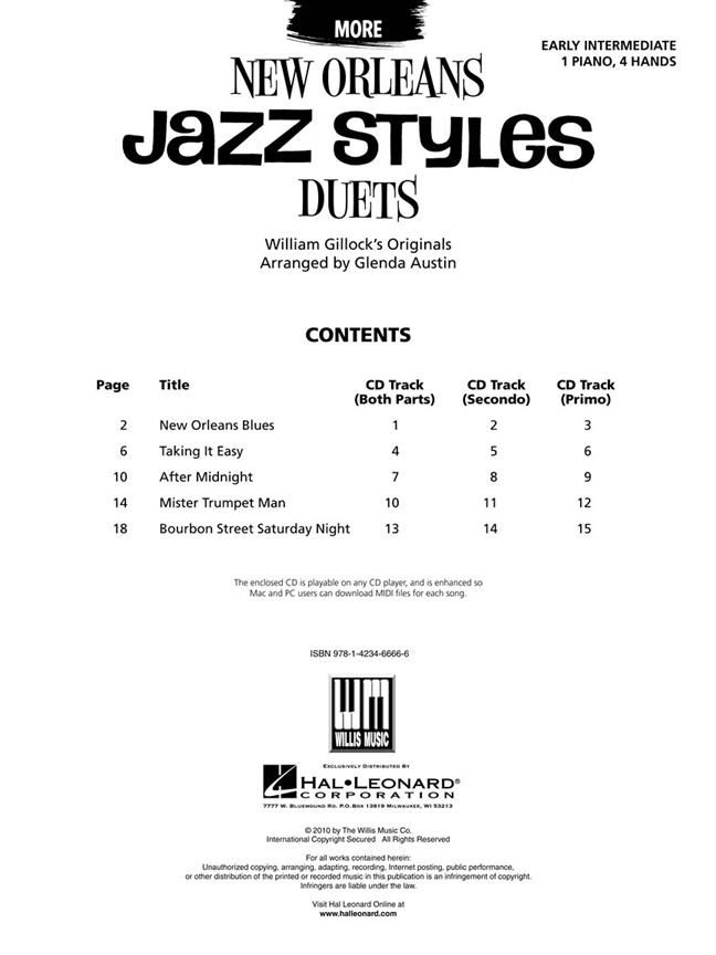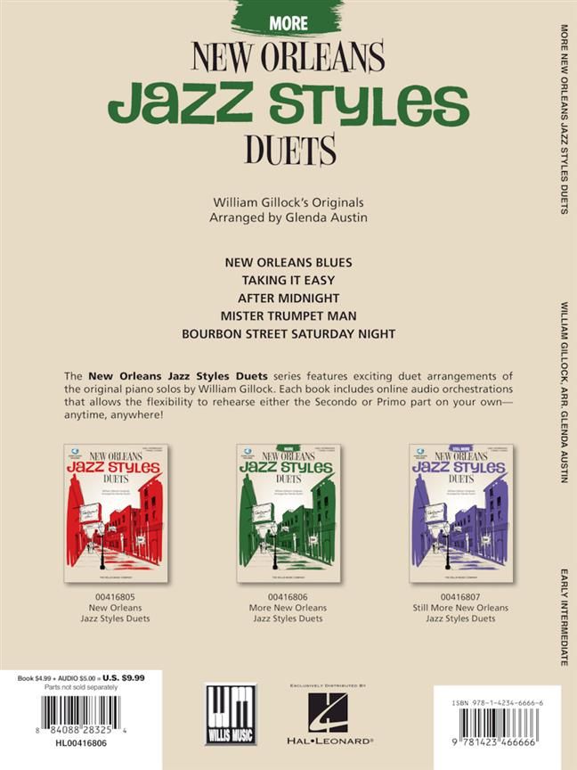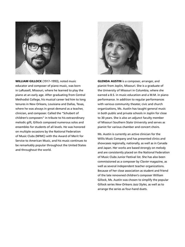 William Gillock's timeless jazz originals have been transformed into engaging and very accessible duets by composer/clinician Glenda Austin. The book also comes with a play-along Online Audio that includes separate Primo and Secondo parts, giving the student the flexibility to rehearse as well as perform on their own when a partner is not available. Excellent collaborative pieces! Contents: New Orleans Blues - Taking It Easy - After Midnight - Mister Trumpet Man - Bourbon Street Saturday Night.
