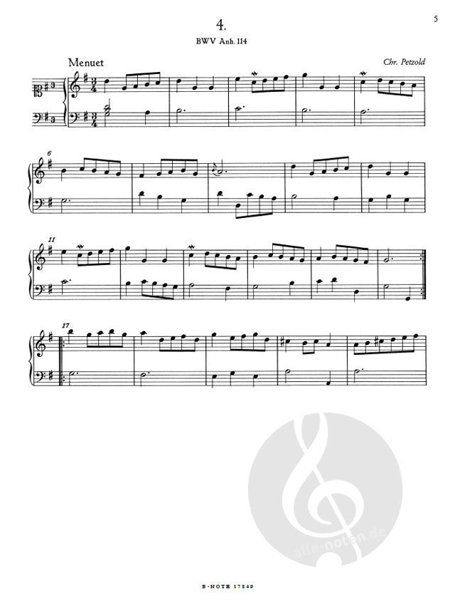 Das Notenbüchlein für Anna Magdalena Bach war im Hause der Bachs eine Art musikalisches Gästebuch: Hier trug vor allem Bachs zweite Ehefrau Anna Magdalena Werke ihres Mannes, ihrer Kinder und von vielen musikalischen Gästen ein. Das Buch wurde wohl zum eigenen Musizieren im Haushalt Bach genutzt. Viele der Werke, darunter auch einige der bekanntesten wie das Menuettpaar Nr. 4 und 5, gelten bis heute weithin als Kompositionen Johann Sebastian Bachs - sie sind aber oft musikalische Mitbringsel zeitgenössischer Musikantenfreunde. Die Menuette beispielsweise stammen von Christian Petzold. Die großen Werke des Notenbüchleins, die Suiten BWV 812, 813, 827 und 830 hat der Herausgeber dieses Bandes, Georg von Dadelsen, nicht aufgenommen. Diese sind regulär neben den anderen Suiten erschienen. Dafür wurden zwei kleine Sonaten von Carl Philipp Emanuel Bach angehängt, in die er Stücke aus dem Notenbüchlein eingearbeit hat.