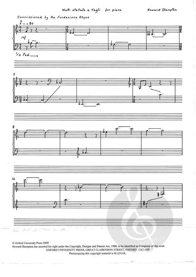 Commissioned by the Atopos Fondazione in Italy, this piece was premiered by John Tilbury on 10 June 2008. A homage to Morton Feldman and a companion piece to his Triadic Memories, Skempton's Notti stellate a Vagli conjures up images of Tuscany, through its, in the composer's words, 'nocturnal tone and stellar texture'.