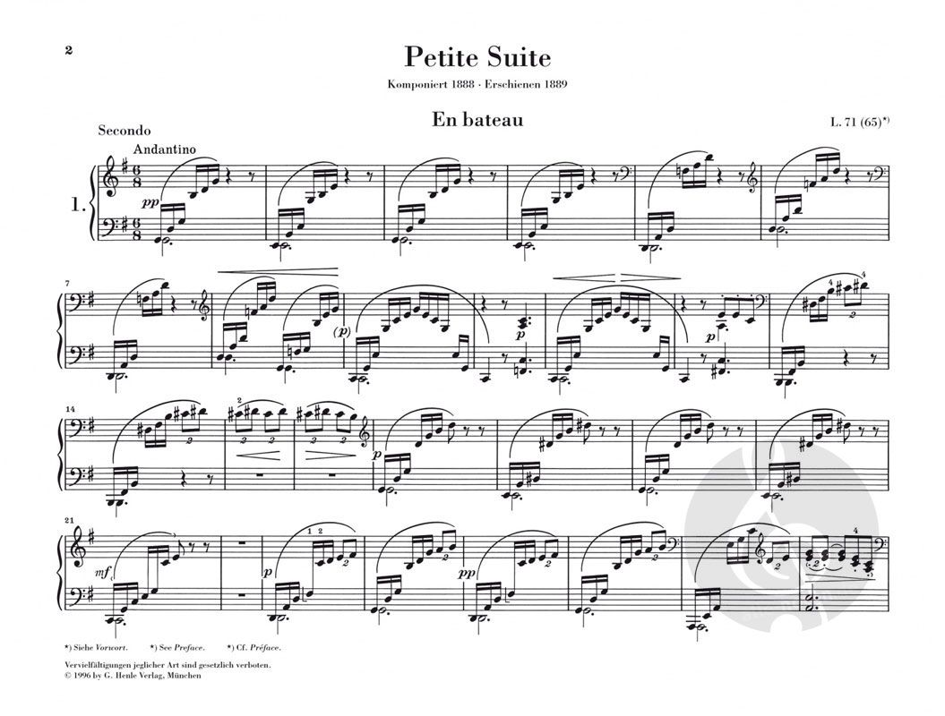 Debussy erarbeitete die viersätzige Suite 1888, gerade aus Italien zurückgekehrt, wo er sich als Rom-Preisträger zu einem Stipendiaten-Aufenthalt in der Villa Medici in Rom aufgehalten hatte. Er spielte die Suite 1889 zusammen mit Paul Dukas am Pariser Konservatorium vor und fand großen Anklang. Unter den Studenten war Henri Busser zugegen, der den Zyklus 1907, als Debussy längst eine Berühmtheit war, für Orchester bearbeitete. Debussy bedankte sich umgehend brieflich bei Busser für die 'geistreiche Orchestrierung'. Das Werk gehört heute im Original und seinen zahlreichen Bearbeitungen zu Debussys meistgespielten Kompositionen.