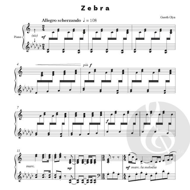 Drei clevere, von Tieren inspirierte Stücke für Klavier. Eisbär verwendet nur die weißen Noten des Klaviers. Die Krähe verwendet nur die schwarzen Noten. Ungewöhnlich ist, dass dieses Stück nur mit der linken Hand gespielt werden kann. Zebra verwendet nur weiße Noten in der rechten Hand und schwarze Noten in der linken Hand.