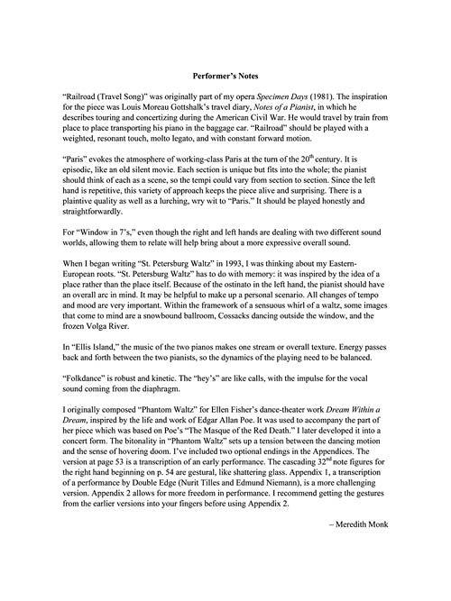 Diese Sammlung für Klavier solo und zwei Klaviere beleuchtet sieben von Meredith Monks Klavierwerken und beinhaltet Aufführungshinweise von der Komponistin.