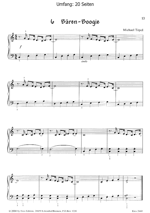 Inhalt:Der dicke und der dünne Bär Eisbären-Song Geburtstagsständchen für Bären Über den Wolken Tatzen-Tango Bären-Boogie Drehorgelbär Spaziergang des Bären im Regen Der Bär in der Hängematte Der Bär springt Trampolin Bärenstarke und trotzdem leichte Musik für Kids. Wenn man sich so eine 'Bärennummer' erarbeitet hat sollte man als Belohnung die Malstifte hervorholen und die hübschen Bilder von Annette Töpel ausmalen!