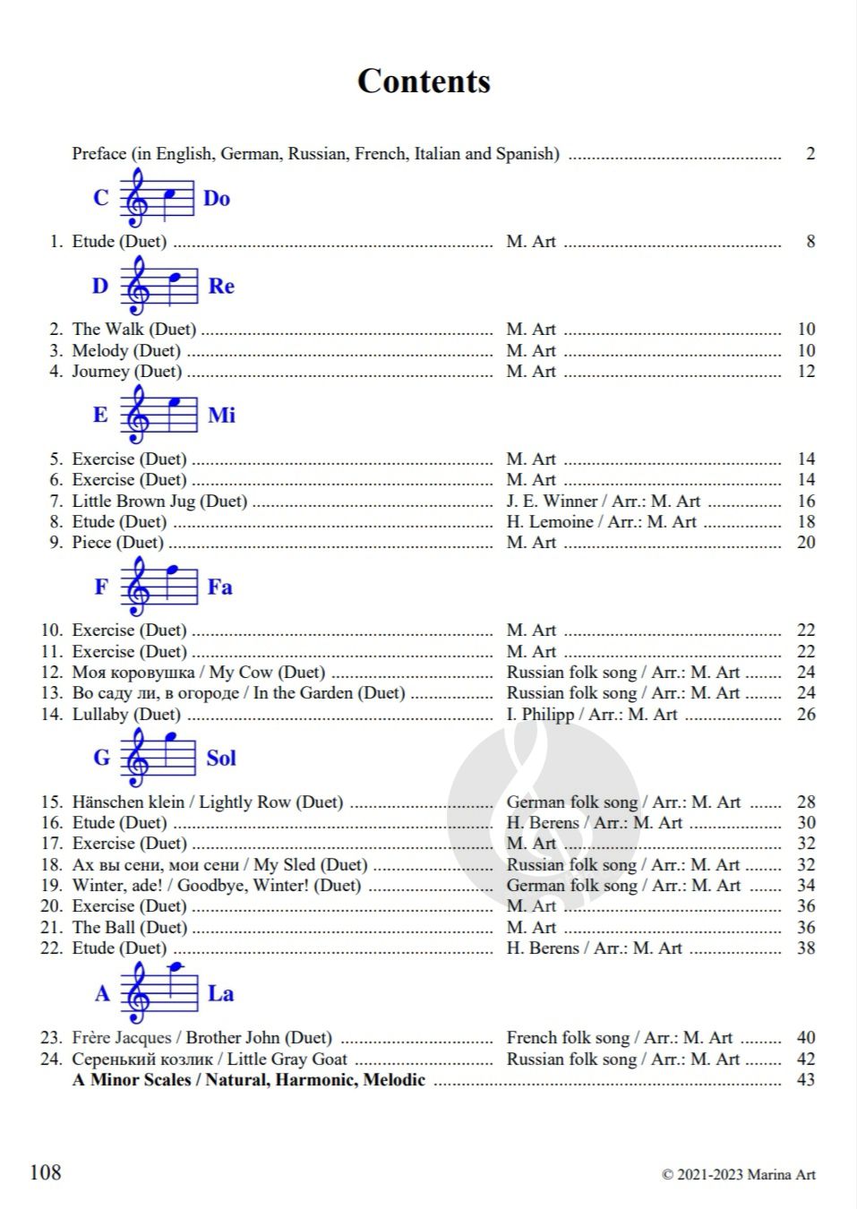 Die Buchreihe Noten lernen Schritt für Schritt besteht aus 7 Bänden. Die Reihenfolge der Bücher entspricht den Farben des Regenbogens. Nach dem Erlernen des ersten, violetten Buches, gehen wir zum blauen Notenbuch über usw. Es besteht auch die Möglichkeit, mehrere Bücher parallel zu studieren. Man kann zum Beispiel das erste und vierte Buch gleichzeitig verwenden usw. Dies kann der Klavierlehrer nach eigenem Ermessen entscheiden. Die ersten vier Bücher sind für Anfänger bestimmt und beinhalten eine zusätzliche Begleitstimme für den Klavierlehrer. Das hilft dabei, den Lernprozess interessant und qualitativ zu gestalten. Die Musikstücke mit Begleitung können auch für das vierhändige Spiel im Unterricht verwendet werden.