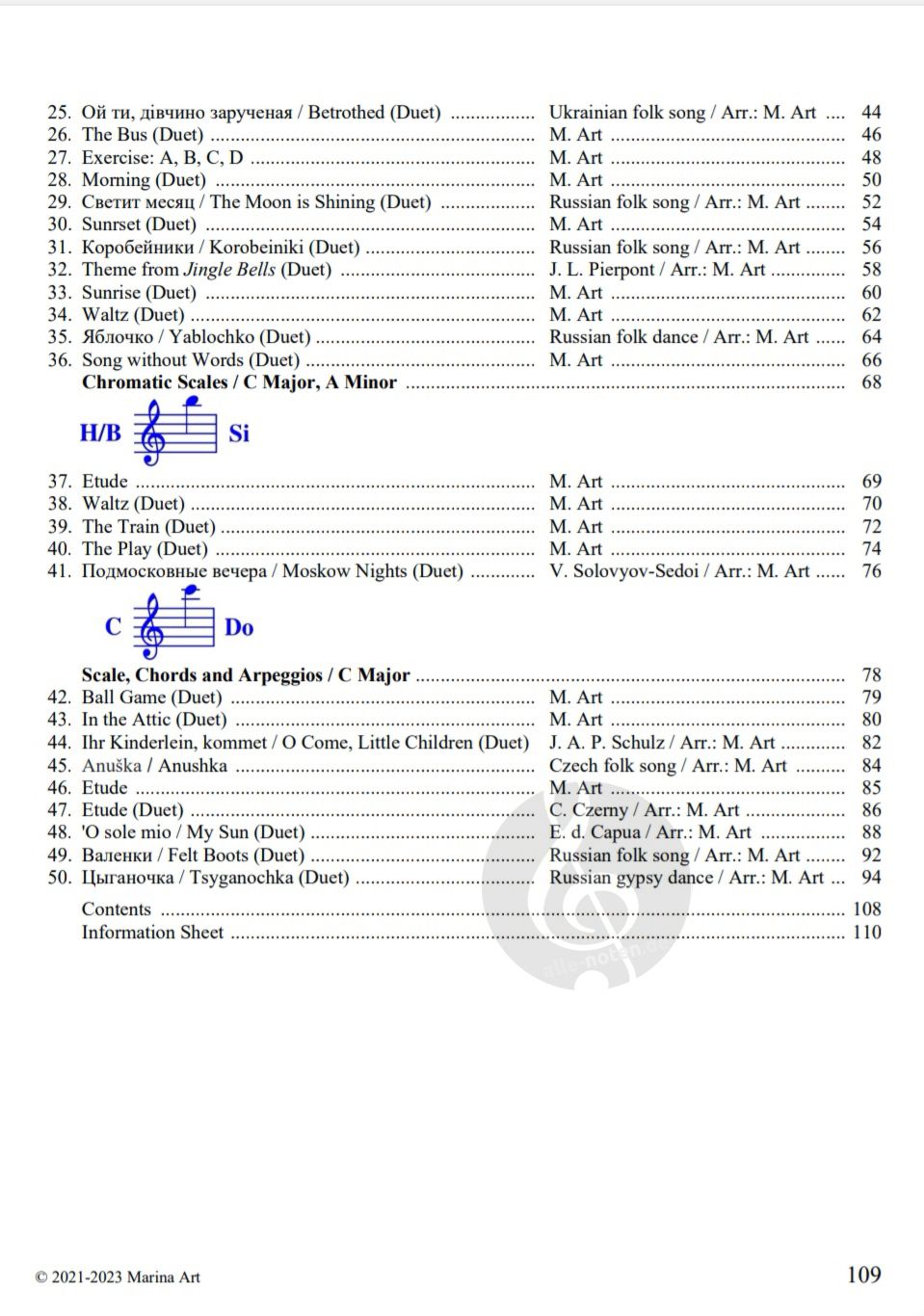 Das musikalische Repertoire ist äußerst abwechslungsreich. Es enthält Volkslieder, von der Autorin komponierte und bearbeitete Werke sowie Musikstücke von berühmten Komponisten wie Bach, Mozart, Beethoven, Chopin und anderen.