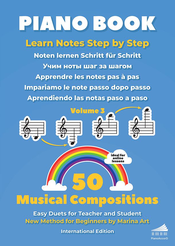 Die Buchreihe Noten lernen Schritt für Schritt besteht aus 7 Bänden. Die Reihenfolge der Bücher entspricht den Farben des Regenbogens. Nach dem Erlernen des ersten, violetten Buches, gehen wir zum blauen Notenbuch über usw. Es besteht auch die Möglichkeit, mehrere Bücher parallel zu studieren. Man kann zum Beispiel das erste und vierte Buch gleichzeitig verwenden usw. Dies kann der Klavierlehrer nach eigenem Ermessen entscheiden. Die ersten vier Bücher sind für Anfänger bestimmt und beinhalten eine zusätzliche Begleitstimme für den Klavierlehrer. Das hilft dabei, den Lernprozess interessant und qualitativ zu gestalten. Die Musikstücke mit Begleitung können auch für das vierhändige Spiel im Unterricht verwendet werden.