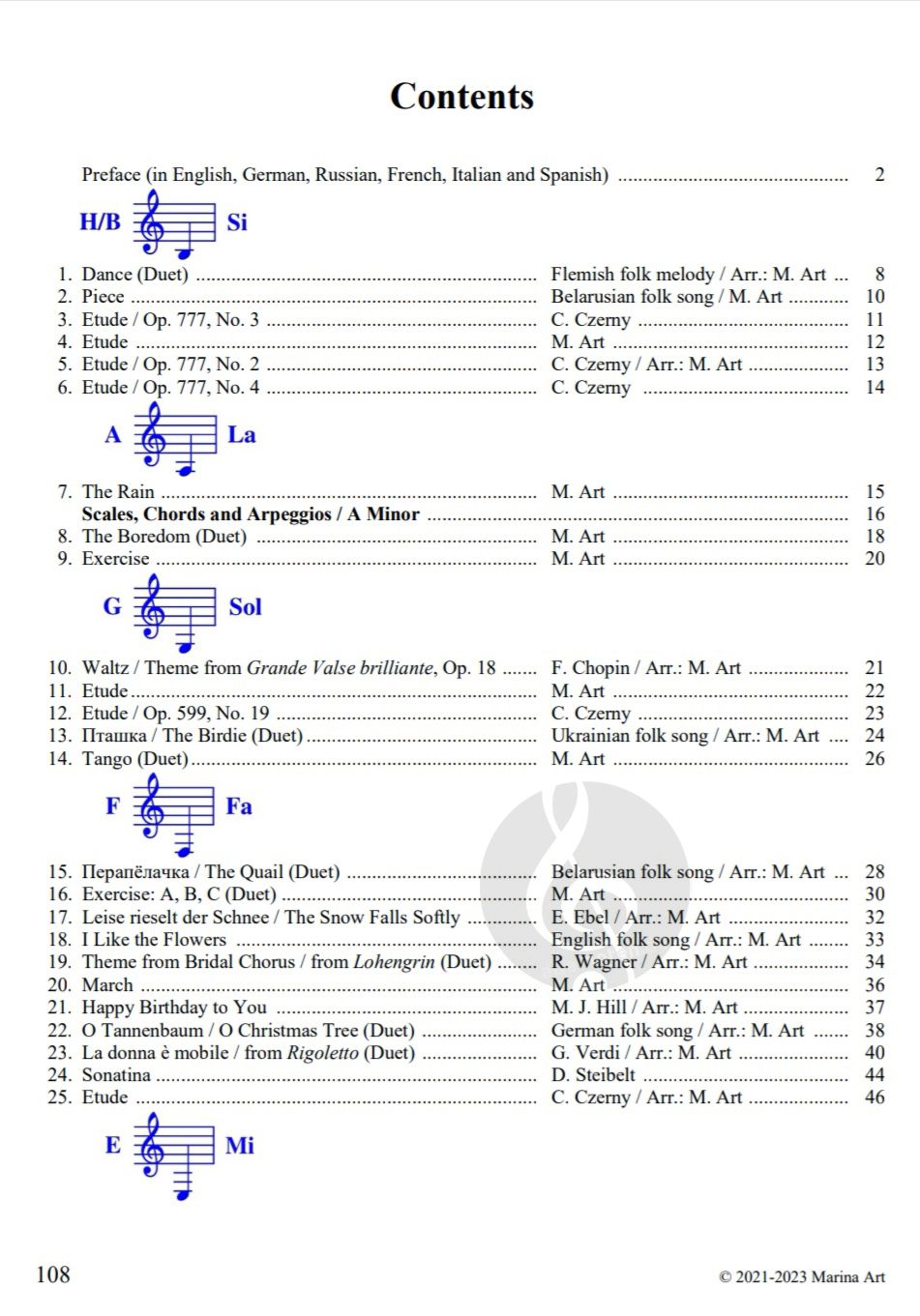 Das musikalische Repertoire ist äußerst abwechslungsreich. Es enthält Volkslieder, von der Autorin komponierte und bearbeitete Werke sowie Musikstücke von berühmten Komponisten wie Bach, Mozart, Beethoven, Chopin und anderen.