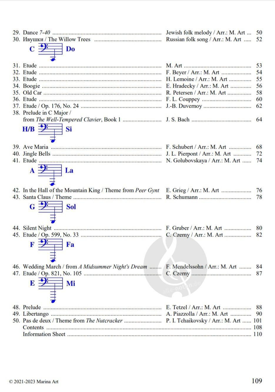 Die Buchreihe Noten lernen Schritt für Schritt besteht aus 7 Bänden. Die Reihenfolge der Bücher entspricht den Farben des Regenbogens. Nach dem Erlernen des ersten, violetten Buches, gehen wir zum blauen Notenbuch über usw. Es besteht auch die Möglichkeit, mehrere Bücher parallel zu studieren. Man kann zum Beispiel das erste und vierte Buch gleichzeitig verwenden usw. Dies kann der Klavierlehrer nach eigenem Ermessen entscheiden. Die ersten vier Bücher sind für Anfänger bestimmt und beinhalten eine zusätzliche Begleitstimme für den Klavierlehrer. Das hilft dabei, den Lernprozess interessant und qualitativ zu gestalten. Die Musikstücke mit Begleitung können auch für das vierhändige Spiel im Unterricht verwendet werden.