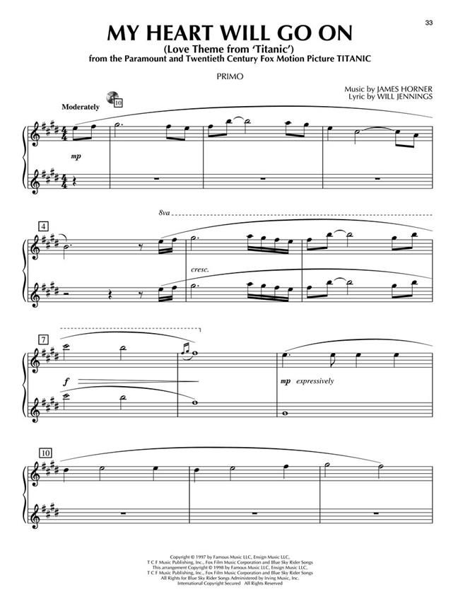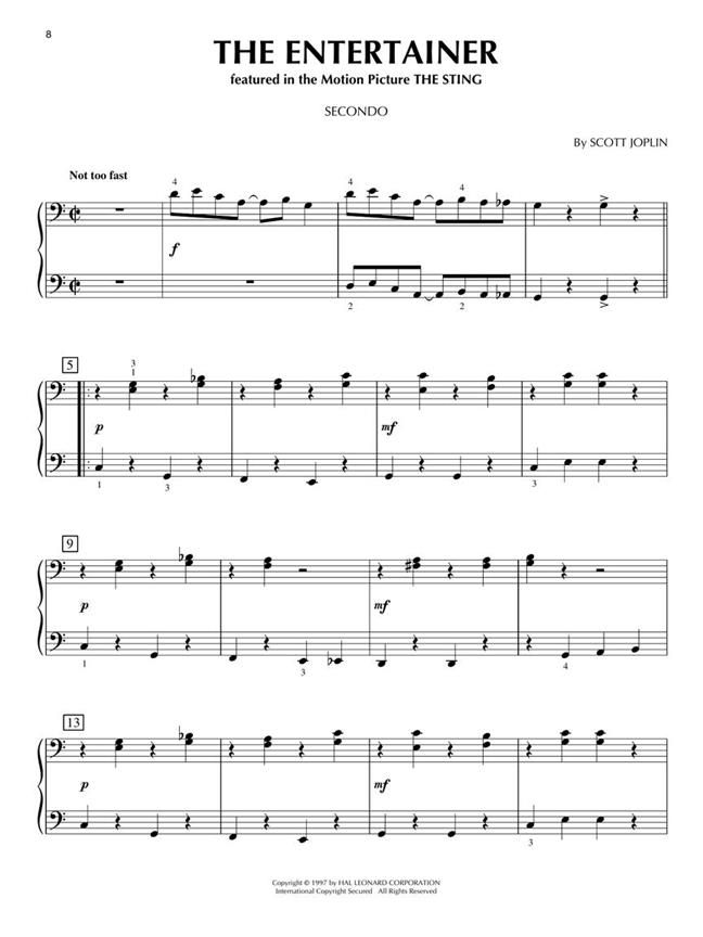 This great new series comes with a Online Audio that features separate tracks for the primo and secondo parts - perfect for practice and performance! 8 songs, including: Chariots of Fire * The Entertainer * Theme from 'Jurassic Park' * My Father's Favorite * My Heart Will Go On (Love Theme from 'Titanic') * Somewhere in Time * Somewhere, My Love * Star Trek(R) the Motion Picture.