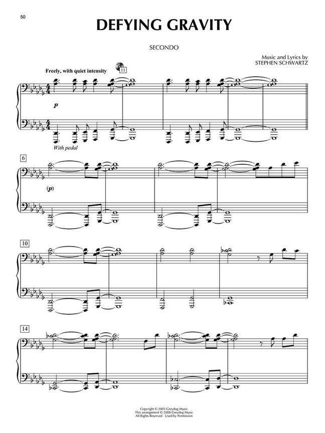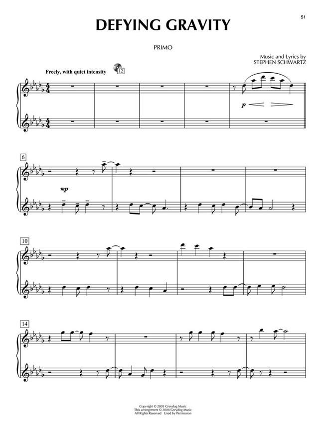 This great series comes with a CD that features separate tracks for the Primo and Secondo parts - perfect for practice and performance! 8 selections from the hit musical, including: Dancing Through Life - Defying Gravity - For Good - I Couldn't Be Happier - I'm Not That Girl - Popular - What Is This Feeling? - The Wizard and I.