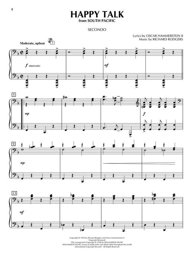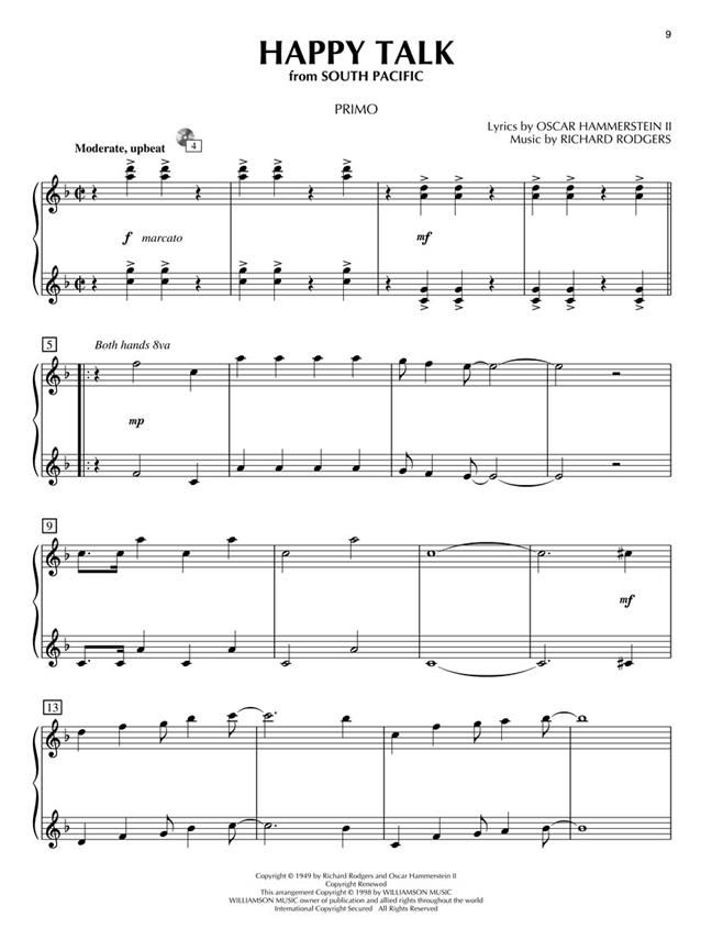 This great series comes with a CD that features separate tracks for the Primo and Secondo parts - perfect for practice and performance! 10 songs, including: Do I Love You Because You're Beautiful? - Happy Talk - Hello, Young Lovers - I Whistle a Happy Tune - If I Loved You - My Favorite Things - People Will Say We're in Love - Some Enchanted Evening - The Surrey with the Fringe on Top - You'll Never Walk Alone.
