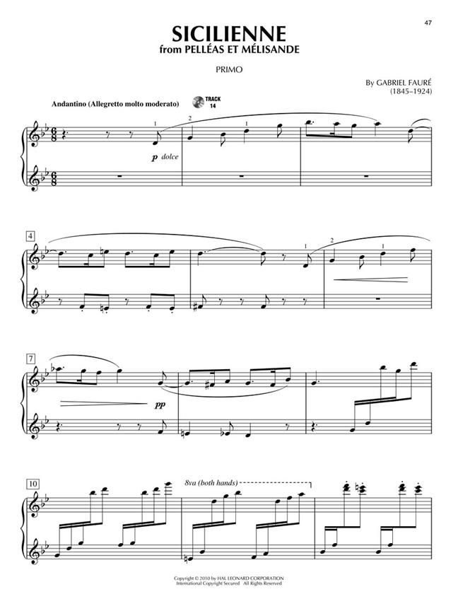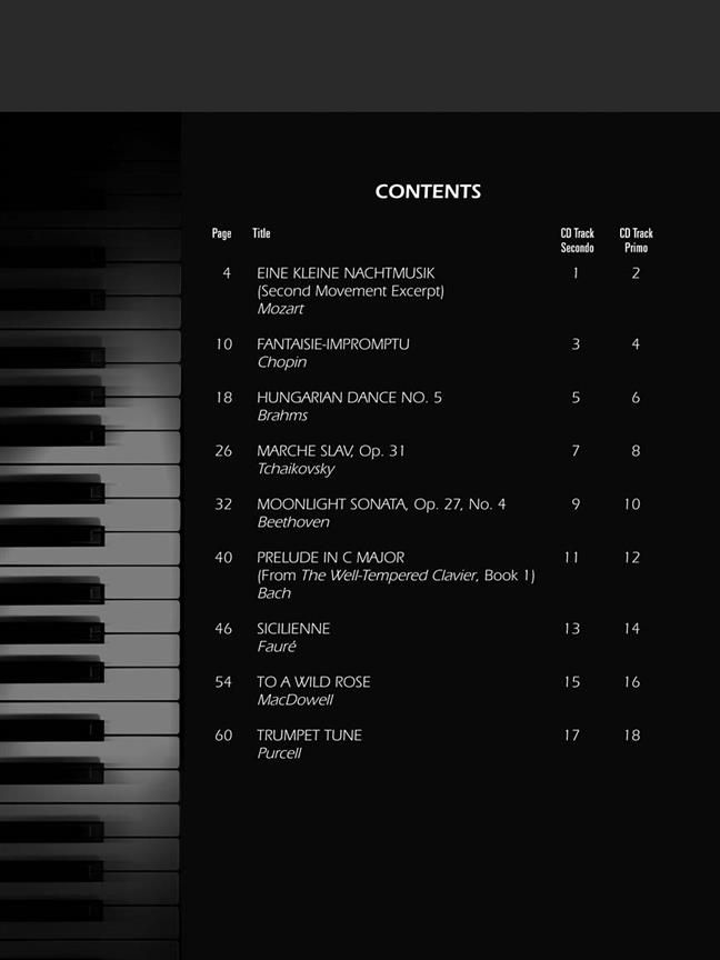 The Piano Duet Play-Along series gives you the flexibility to rehearse or perform piano duets anytime, anywhere! Play these duet arrangements with a partner, or use the accompanying Online Audio to play along with either the Secondo or Primo part on your own. The audio Online Audio is playable on any Online Audio player, and also enhanced so PC and Mac users can adjust the recording to any tempo without changing pitch. Features 9 great duets: Eine Kleine Nachtmusik (Romance) (Mozart) - Fantaisie-Impromptu (Chopin) - Hungarian Dance No. 5 (Brahms) - Marche Slav, Op. 31 (Tchaikovsky) - Moonlight Sonata (Beethoven) - Prelude in C Major (Bach) - Sicilienne (Faure) - To a Wild Rose (MacDowell) - Trumpet Tune (Purcell).