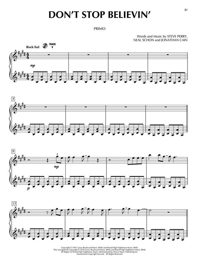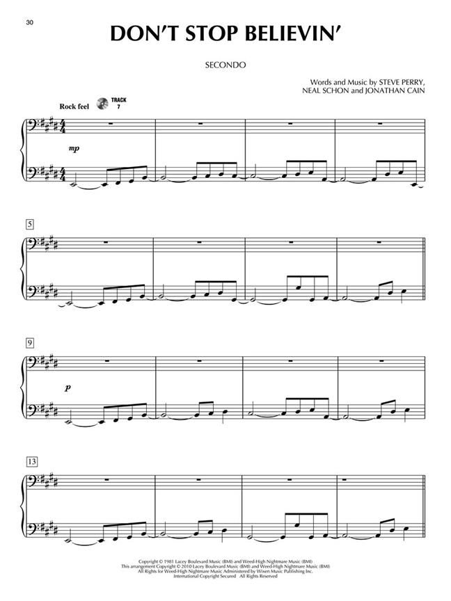 The Piano Duet Play-Along series gives you the flexibility to rehearse or perform piano duets anytime, anywhere! Play these duet arrangements with a partner, or use the accompanying CD to play along with either the Secondo or Primo part on your own. The audio CD is playable on any CD player, and also enhanced so PC and Mac users can adjust the recording to any tempo without changing pitch. Features 9 great duets: Alone - Bad Romance - Defying Gravity - Don't Stop Believin' - Endless Love - I Dreamed a Dream - Like a Prayer - My Life Would Suck Without You - True Colors.