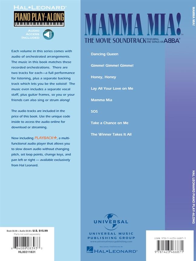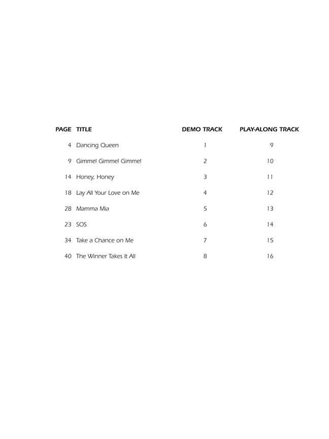 8 songs from the smash movie musical featuring the hits of ABBA with backing and demonstration tracks. The tracks can be accessed online using the unique code inside each book and can be streamed or downloaded. The audio filesinclude PLAYBACK+, a multi-functional audio player that allows you to slow down audio without changing pitch, set loop points, change keys, and pan left or right.