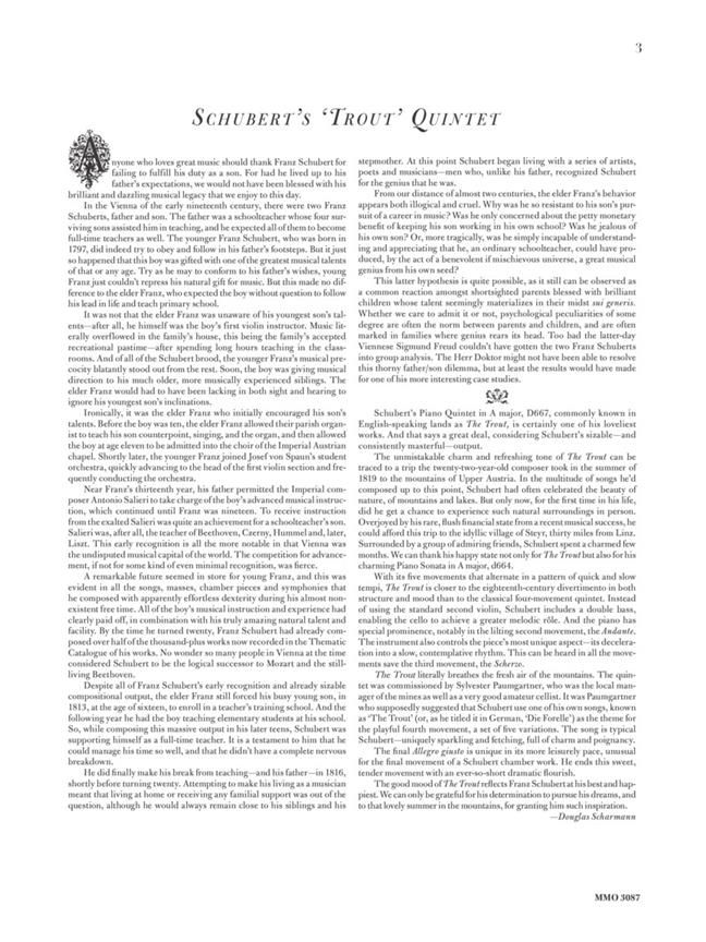 Accompaniment: The Classic String Quartet - Schubert's seminal chamber composition, the Piano Quintet in A major, D667, commonly known as 'The Trout' or 'Die Forelle, ' is certainly one of the greatest pieces of music ever penned. Its rich textures and lovely melody create an unforgettable musical experience. Its celebration of nature's beauty stems from a summer trip in the Austrian Alps which inspired the young Schubert to rework a song into this complex chamber-piece. Composed of five alternating movements, 'The Trout' uses unique orchestration (substituting a double bass for the second violin) and gives special emphasis to the piano as well. But all the instruments take an equal role, and this may also be a reason for the piece's eternal popularity. 'The Trout' instantly brings to mind the calm serenity of the summer mountain air, and its sparkling melody and gentle poignancy leave a particularly happy feeling in both player and listener. It is a joy-filled piece but at the same time is filled with a serene quality that makes it one of the most exhilarating pieces for any musician to play, and one of the most important compositions for any musician to learn. This Music Minus One edition gives you that opportunity, in the comfort of your own home.