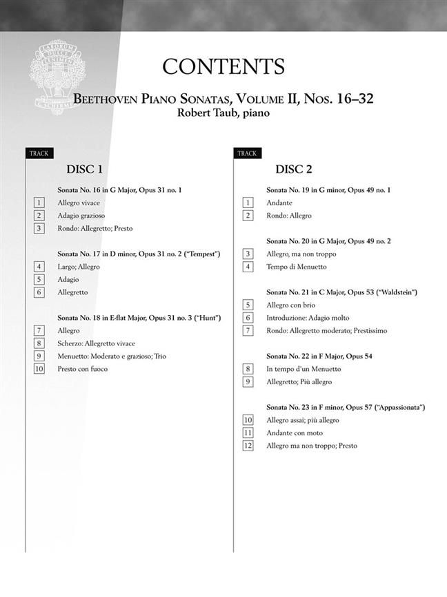 The first fifteen Beethoven sonatas on five CDs recorded by pianist Robert Taub. This publication is a companion to Beethoven Piano Sonatas, Volume II, edited by Robert Taub (HL00296633).