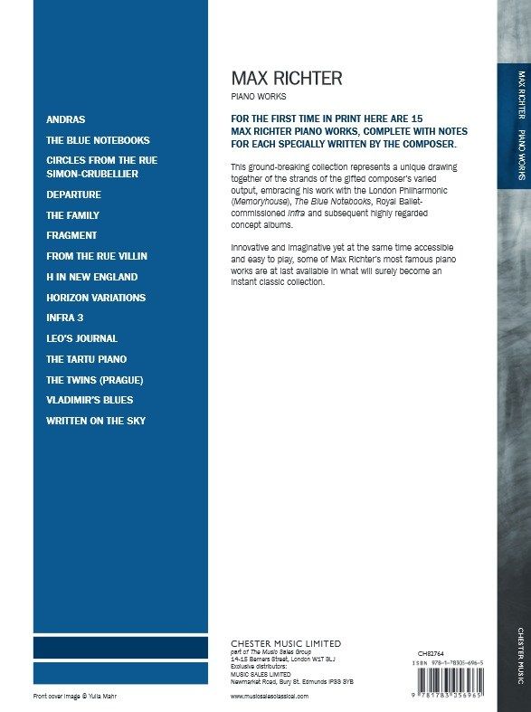Diese bahnbrechende Sammlung stellt eine einzigartige Zusammenstellung der Stränge des vielfältigen Schaffens des begabten Komponisten dar und umfasst seine Arbeit mit dem London Philharmonic (Memoryhouse), The Blue Notebooks, dem vom Royal Ballet in Auftrag gegebenen Infra und nachfolgenden hoch angesehenen Konzeptalben. Innovativ und phantasievoll, aber gleichzeitig zugänglich und leicht zu spielen, sind einige von Max Richters berühmtesten Klavierwerken endlich in einer Sammlung erhältlich, die sicherlich sofort zu einer klassischen Sammlung werden wird. Dieser Band enthält die Werke Andras, The Blue Notebooks, Circles From The Rue Simon-Crubellier, Departure, The Family und mehr.