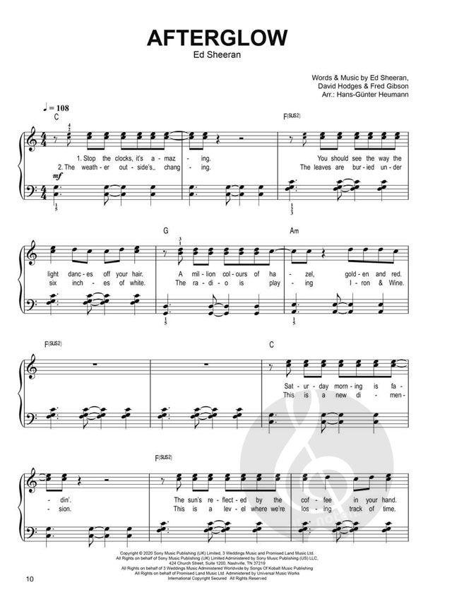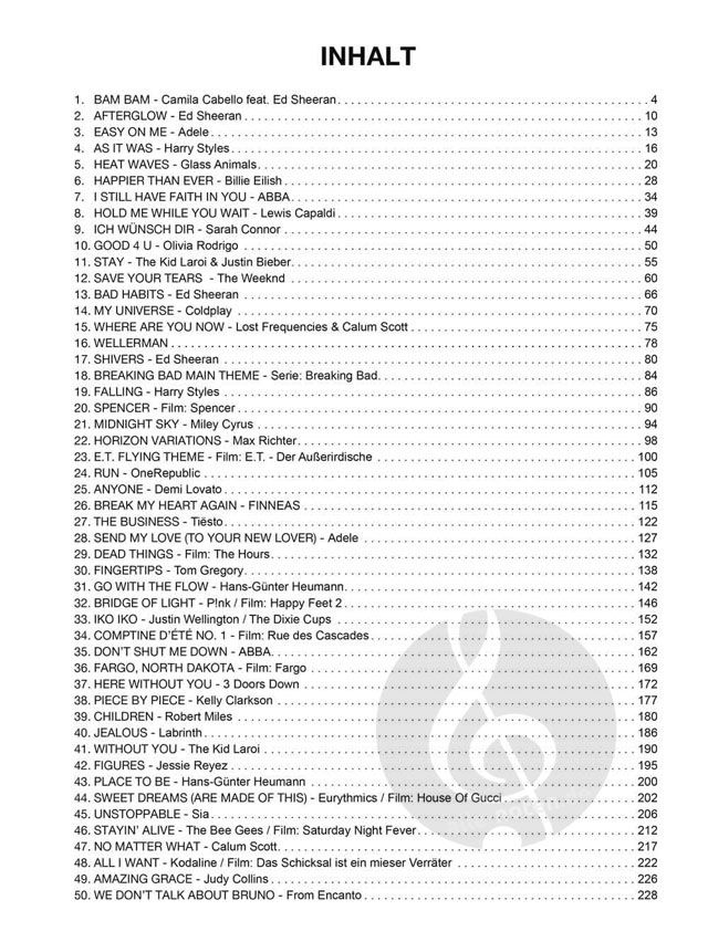 Alle Titel wurden von Hans-Günter Heumann wie gewohnt leicht arrangiert und bieten ein unkompliziertes Spielvergnügen für Anfänger:innen, Wiedereinsteiger:innen und Fortgeschrittene. Ein weiterer Pluspunkt des Songbooks ist die praktische Spiralbindung. Die Titelliste umfasst wieder eine großartige Auswahl an populären Charthits, wie Bam Bam (Camila Cabello feat. Ed Sheeran), Falling (Harry Styles), Unstoppable (Sia), Good For U (Olivia Rodrigo) oder Save Your Tears (The Weeknd). Dazu kommen bekannte Film- und Serienmusiken wie We Don't Talk About Bruno aus 'Encanto', Flying Theme von John Williams aus 'E. T. - Der Außerirdische' oder Fargo, North Dakota aus 'Fargo'.