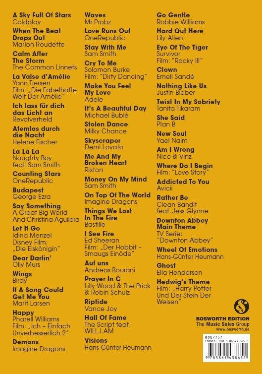 Die Titelliste umfasst eine große Auswahl an populären Charthits, z. B. A Sky Full Of Stars (Coldplay), Atemlos durch die Nacht (Helene Fischer), Budapest (George Ezra), Let It Go (Frozen/Die Eiskönigin), Happy (Pharell Williams), Demons (Imagine Dragons), Love Runs Out (OneRepublic), Stay With Me (Sam Smith), I See Fire (Ed Sheeran), Auf Uns (Andreas Bourani), Prayer In C (Lilly Wood, The Prick & Robin Schulz) oder Addicted To You (Avicii). Dazu kommen bekannte Filmmusiken aus u. a. Die fabelhafte Welt der Amélie, Dirty Dancing, Der Hobbit, Love Story oder Harry Potter.