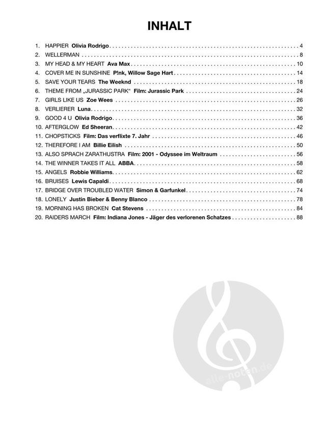Die Titelliste umfasst eine große Auswahl an populären Charthits, wie Wellerman, My Head & My Heart (Ava Max), Good 4 U (Olivia Rodrigo), Girls Like Us (Zoe Wees), The Winner Takes It All (ABBA). Dazu kommen bekannte Filmmusiken, u. a. Raiders March aus 'Indiana Jones' sowie Theme from Jurassic Park aus 'Jurassic Park'.