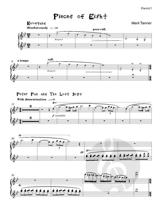 Pieces of Eight ist ein originelles Konzertstück für Klavier mit einer Dauer von etwas mehr als 5 Minuten. Mit dem Untertitel "Scenes from Peter Pan, for four intrepid pianists" (Szenen aus Peter Pan, für vier unerschrockene Pianisten) beginnt die Musik mit einem kühnen Schwung - einem verlockend kurzen Blick aus Nimmerland, der einer düsteren und doch bezaubernden Einführung in Peter Pan und die verlorenen Jungs Platz macht. Es dauert nicht lange, bis wir von Kapitän Hook hören - düster und bedrohlich -, eine Musik, die ohne Verzögerung in die Feen übergeht; eine flüchtige, windige Szene, die unaufhaltsam auf die erste kurze Atempause der Musik zusteuert. Wendy Darlings Melodie ist zärtlich und sehnsüchtig, ihre Harmonien wandern frei durch alle Regionen der Tastatur. Der Auftritt von Mr. Smee ist abrupt und unerwartet - Musik, die alle Wolken, die sich vielleicht angesammelt haben, wegbläst. Was folgt, ist eine willkommene neue Klangtextur in Form von Tinker Bell. Und dann, hochfliegend und furchtlos, kommt Peter Pan Fies, Musik, die die Erzählung entscheidend vorantreibt; die darauf folgende Kampfszene ist frech und aufregend für alle vier Spieler, wenn die Hände in die Tasten hüpfen und wieder herauskommen - jetzt glühend heiß von dem ganzen Tumult. Hook's Last Stand hält die Spieler (und das Publikum) auf Trab - die vorletzte Szene in diesem aufregenden, spritzigen Stück. Die abschließende Szene, An Intrepid Escape, bringt die Musik zu einem mitreißenden, atemlosen Ende, von dem sich alle vier Pianisten eine wohlverdiente Pause gönnen können...