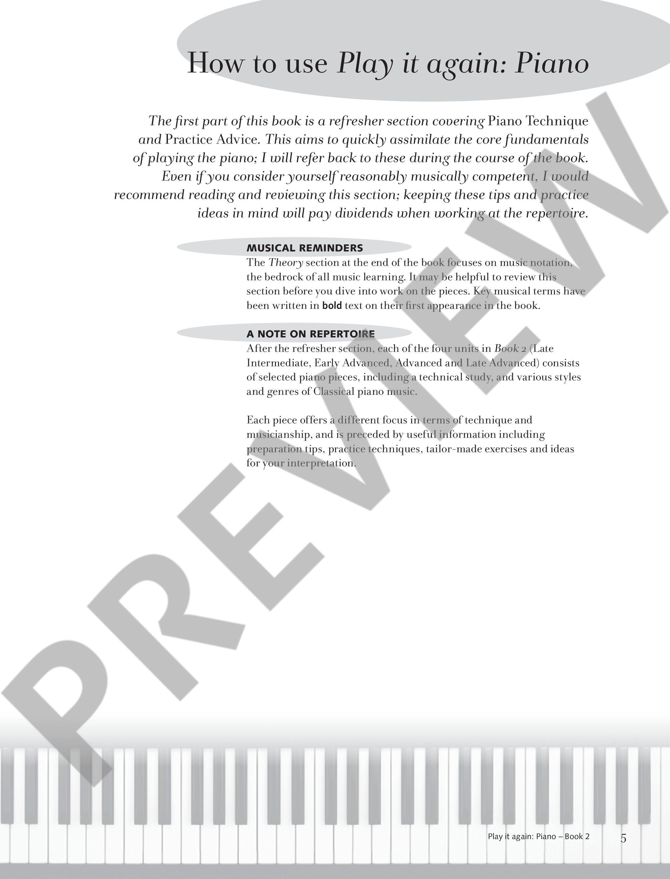 Maßgeschneidert für Pianisten, die lange nicht am Klavier saßen, motiviert das englischsprachige Lehrbuch, sich erneut mit diesem erfüllenden Zeitvertreib auseinanderzusetzen. Jedes Stück wird begleitet von zwei Seiten mit zahlreichen leicht verständlichen Übe-Tipps, die zur Geläufigkeit und Fingerfertigkeit beitragen. Die Bände enthalten darüber hinaus noch weitere Abschnitte zu Klaviertechnik und -theorie, welche Musik und Technik umfassend beleuchten.