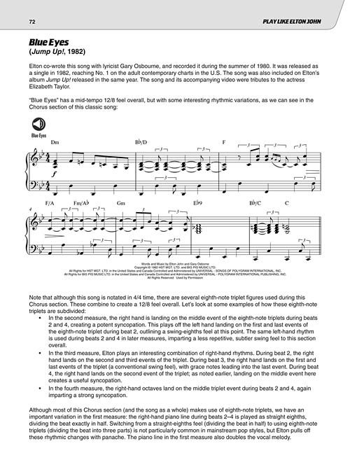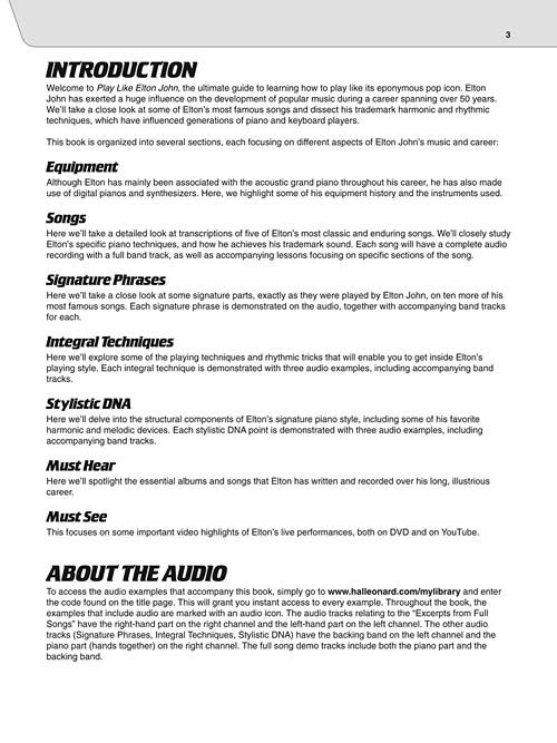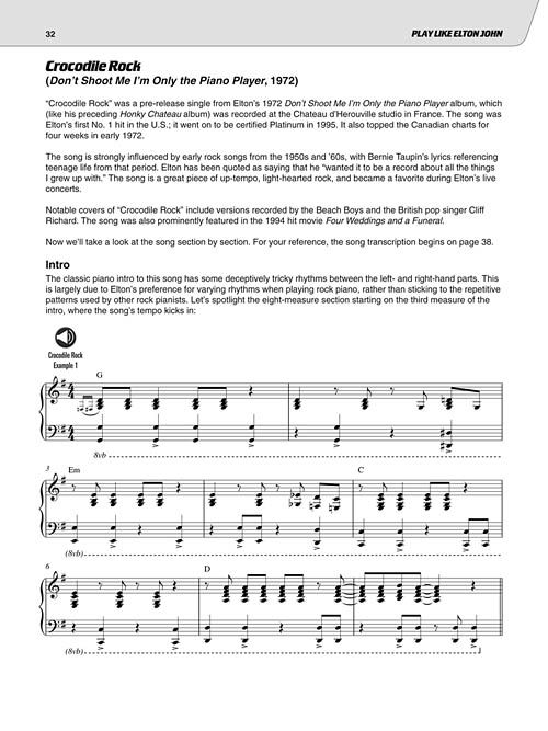 Study the trademark songs and signature phrases of the Rocket Man himself! This comprehensive book and audio teaching method provides detailed analysis of Elton John's grand pianos, techniques, styles, licks and much more. You'll learn everything you need to know about Elton's legendary piano playing and find lists of recommended recordings and DVDs. It includes excerpts from 10 songs, plus five full songs: Don't Let the Sun Go Down on Me • Rocket Man • Crocodile Rock • Your Song • Sorry Seems to Be the Hardest Word.