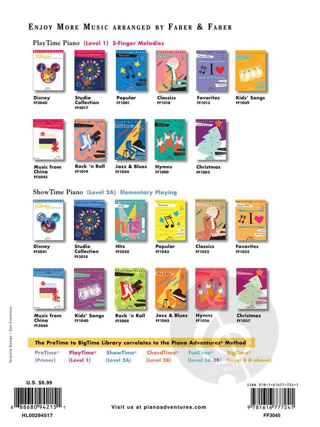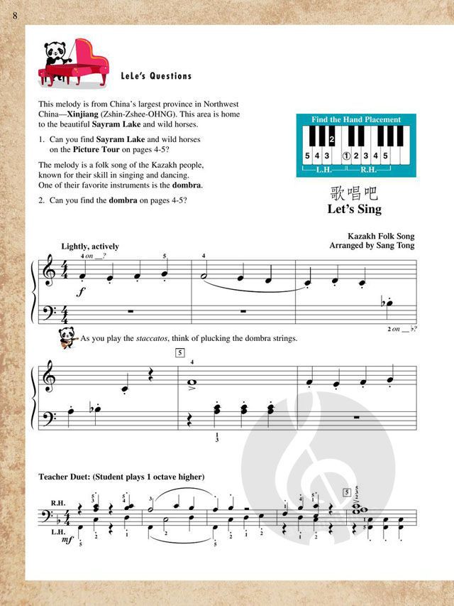 PlayTime Piano Music from China is a musical journey featuring energetic dances, quiet folk melodies, and original Chinese pieces. The book is arranged especially for the early elementary student and correlates with Level 1 in the Piano Adventures method. At this level, five-finger positions reinforce tonalities and intervals. Teacher duets provide a full, rich background. Along the way, students meet LeLe the musical panda, their whimsical guide to exploring the Chinese sound through discovery questions, improvisation, and composition activities. A picture tour of China, unique at each level of the series, introduces highlights of history and culture. Songs include: FengyangFlower-Drum - Frog Dance - Let's Sing - Pouch Embroidering - Song of the Newsboy - Tune from Xinjiang - What Is the Most Beautiful.
