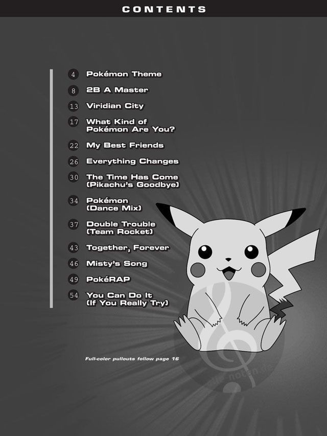 This great songbook features easy piano arrangements of 13 tunes from the hit TV series: 2. B. A. Master - Double Trouble (Team Rocket) - Everything Changes - Misty's Song - My Best Friends - Pokémon (Dance Mix) - Pokémon Theme - PokéRAP - The Time Has Come (Pikachu's Goodbye) - Together, Forever - Viridian City - What Kind of Pokémon Are You? - You Can Do It (If You Really Try). Includes a full-color, 8-page pull-out section featuring characters and scenes from this super hot show.