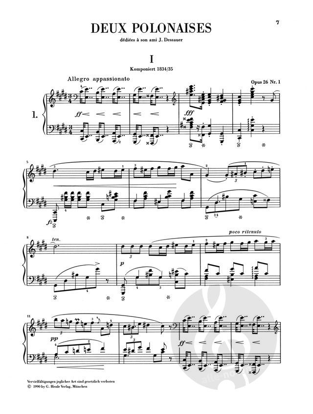 Die Polonaise taucht als stilisierter Tanz in der Kunstmusik bereits seit dem Ende des 16. Jahrhunderts auf. Chopin legte mit seinen Polonaisen gleichzeitig ein Bekenntnis zu seinem Heimatland Polen ab. Die Gattung beschäftigte ihn gewissermaßen von Kindheit an. Sein frühestes gedrucktes Werk war eine Polonaise (KK IIa Nr. 1 in g-moll), die er mit sieben Jahren komponiert hatte. Auch die erst postum veröffentlichten drei Polonaisen op. 71 sowie KK IVa Nr. 1-3, 5 und 8 sind Jugendwerke aus der Warschauer Zeit. Reife Werke sind dann die sieben großen Polonaisen Op. 26 Nr. 1 und 2, Op. 40 Nr. 1 und 2, Op. 44 und 53 und vor allem die Polonaise-Fantaisie op. 61 von 1845/46, Chopins letzte große Klavierkomposition. In ihrer Mischung aus Festlichkeit und Eleganz, aus Kraft und Geschmeidigkeit, aus heroischem Pathos und lieblicher Anmut sind sie alle Zeugen der großen Kunst dieses Komponisten.