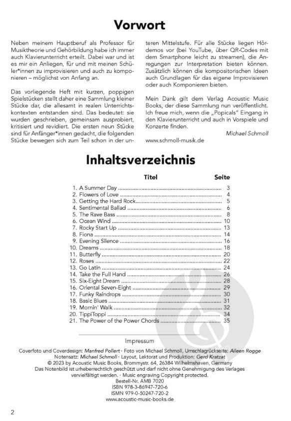 Die ersten neun Stücke sind für Anfänger gedacht. Die folgenden bewegen sich zum Teil schon in der Mittelstufe. Alle sind vollwertige Vorspielstücke, können aber auch als Grundlage für das eigene Improvisieren oder Komponieren dienen.
