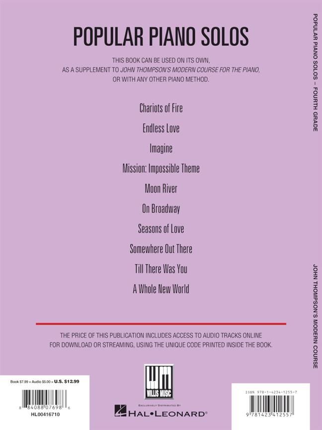 This book/CD pack can be used on its own, as a supplement to John Thompson's Modern Course for the Piano, or with any other piano method. The audio CD is playable on any CD player, and also enhanced so PC and Mac users can access MIDI files for each song. 10 all-time favorites: Chariots of Fire • Endless Love • Imagine • Mission: Impossible Theme • Moon River • On Broadway • Seasons of Love • Somewhere Out There • Till There Was You • A Whole New World.