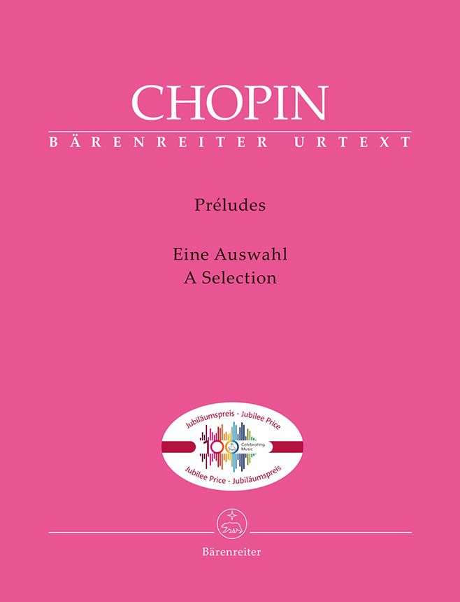 Diese Sammlung neun ausgewählter „Préludes“ erscheint im Rahmen der Veröffentlichung einer Reihe beliebter Werke aus dem Bärenreiter-Programm zum 100-jährigen Verlagsjubiläum. Die vollständige Urtext-Ausgabe der „Préludes op. 28“, die das „Prélude op. 45“ einschließt (BA09610), bietet neben Chopins eigenen und denjenigen seiner Schülerinnen ergänzend historisch-informierte Fingersätze sowie Hinweise zur historischen Aufführungspraxis, insbesondere zum Einsatz des Pedals, zur Ornamentik, zu „Überlegato“ bzw. „Legatissimo“, zu latenter Mehrstimmigkeit (Cantilene), Dynamik, Rubato und Tempo.