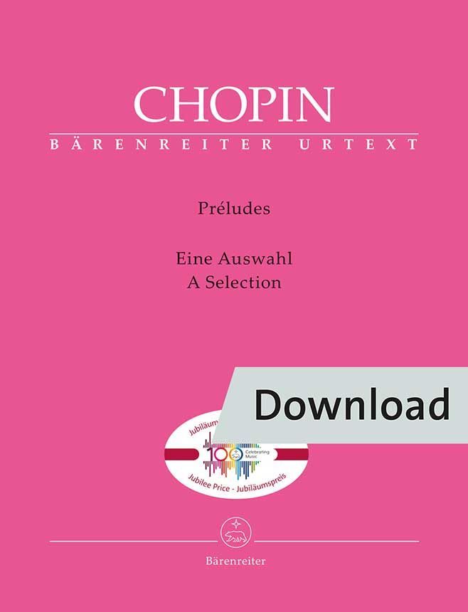 Diese Sammlung neun ausgewählter "Préludes" erscheint im Rahmen der Veröffentlichung einer Reihe beliebter Werke aus dem Bärenreiter-Programm zum 100-jährigen Verlagsjubiläum. Die vollständige Urtext-Ausgabe der "Préludes op. 28", die das "Prélude op. 45" einschließt (BA09610), bietet neben Chopins eigenen und denjenigen seiner Schülerinnen ergänzend historisch-informierte Fingersätze sowie Hinweise zur historischen Aufführungspraxis, insbesondere zum Einsatz des Pedals, zur Ornamentik, zu "Überlegato" bzw. "Legatissimo", zu latenter Mehrstimmigkeit (Cantilene), Dynamik, Rubato und Tempo.