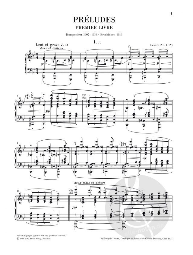 Nach mehreren Einzelstücken und einigen kleineren Klavierzyklen erschienen 1910 die kurz zuvor komponierten Préludes, Premier Livre. Mit dem Titel knüpft Debussy an den traditionellen Formenkanon an, etwa nach dem Vorbild Chopins. Er charakterisiert zusätzlich seine Präludien diskret, indem er zwar auf Überschriften verzichtet, den Stücken aber programmatische Hinweise nachstellt. Dieses erste Heft der Préludes wurde sofort zum großen Erfolg und gilt bis heute als Inbegriff Debussy'scher Klavierkunst. Dabei sind einige dieser substanzreichen Stücke auch für Klavierspieler erreichbar, die nicht zur Zunft der Podiumsvirtuosen gehören.