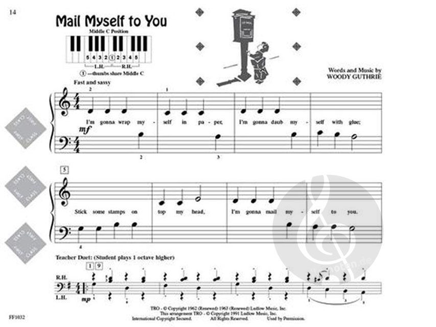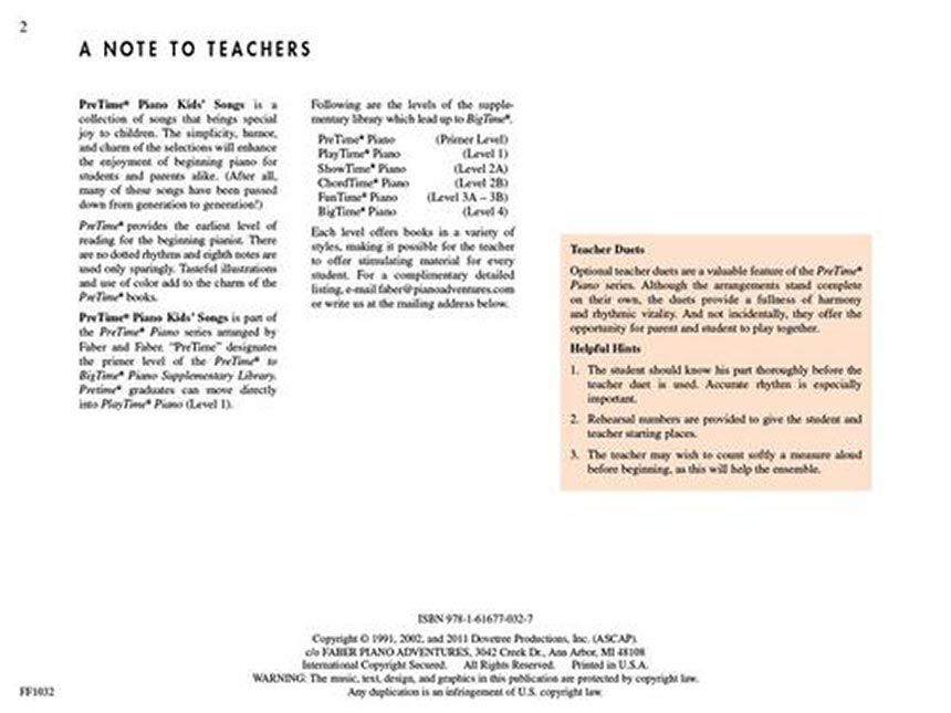 PreTime Piano Kids' Songs is a collection of songs that brings special joy to children. The simplicity, humor, and charm of the selections will enhance the enjoyment of beginning piano for students and parents alike. After all, many of these songs have been passed down from generation to generation: A-Tisket, A-Tasket - Bingo - The Dwarfs' Yodel Song (The Silly Song) - Happy Birthday to You - Mail Myself to You - Mickey Mouse March - On Top of Spaghetti - The Train Song - Winnie the Pooh. The PreTime Piano series provides the earliest level of reading for the beginning pianist. There are no dotted rhythms and eighth notes are used only sparingly. Tasteful illustrations and use of color add to the charm of the books.