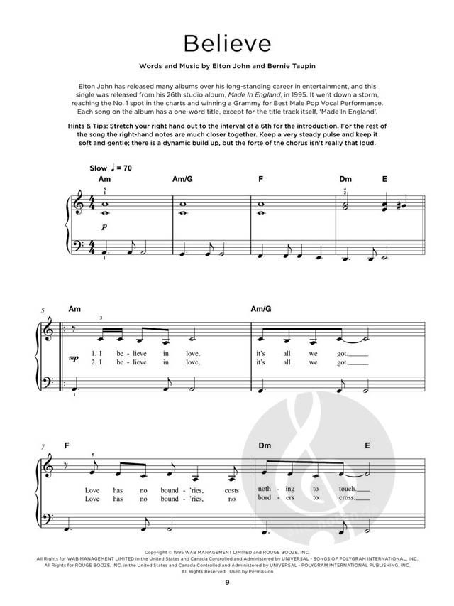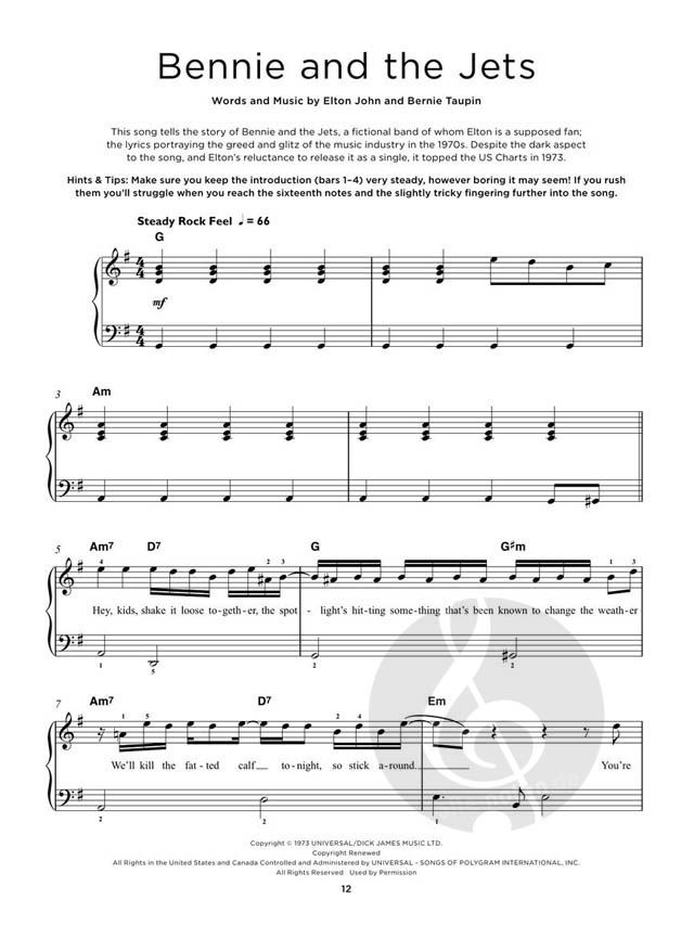 This volume features 40 Elton John hits, including: 'Bennie and the Jets', 'Can You Feel the Love Tonight', 'Rocket Man', 'Your Song' and many more. The songs in this collection have been specially arranged for really easy piano with chord symbols and lyrics. Each song is presented with background notes and hints & tips to help you improve your performance!This volume features 40 Elton John hits, including: 'Bennie and the Jets', 'Can You Feel the Love Tonight', 'Rocket Man', 'Your Song' and many more. The songs in this collection have been specially arranged for really easy piano with chord symbols and lyrics. Each song is presented with background notes and hints & tips to help you improve your performance!