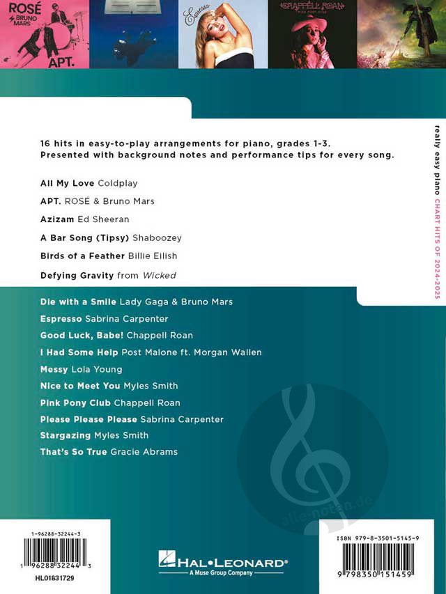 16 Hits in leicht spielbaren Arrangements für Klavier, Schwierigkeitsstufen 1–3. Darunter Hits von Billie Eilish, Sabrina Carpenter, Bruno Mars und Myles Smith. Mit Hintergrundinformationen und Performance-Tipps zu jedem Song.