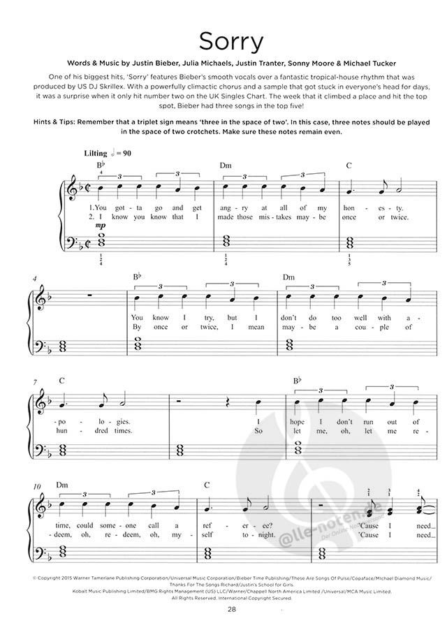 This Really Easy Piano Justin Bieber songbook presents 16 of Bieber's greatest hits, complete with performance hints and tips and background notes for each song. Perfect for beginner pianists or young players looking to learn Bieber's best songs from his early career right up to the present, this songbook features easy piano arrangements. Including Bieber's early hits like Baby, Eenie Meenie and Mistletoe, through to his massive hits Love Yourself, Sorry and Where Are ü Now, this Really Easy Piano collection is ideal for long-term fans of the singer or for those looking to learn his catchy melodies and memorable songs. Each tune that's included comes with fascinating background information, as well as performance hints and tips that will help you get the most out of playing these 16 hits. Chord symbols and fingering guidance is included throughout.